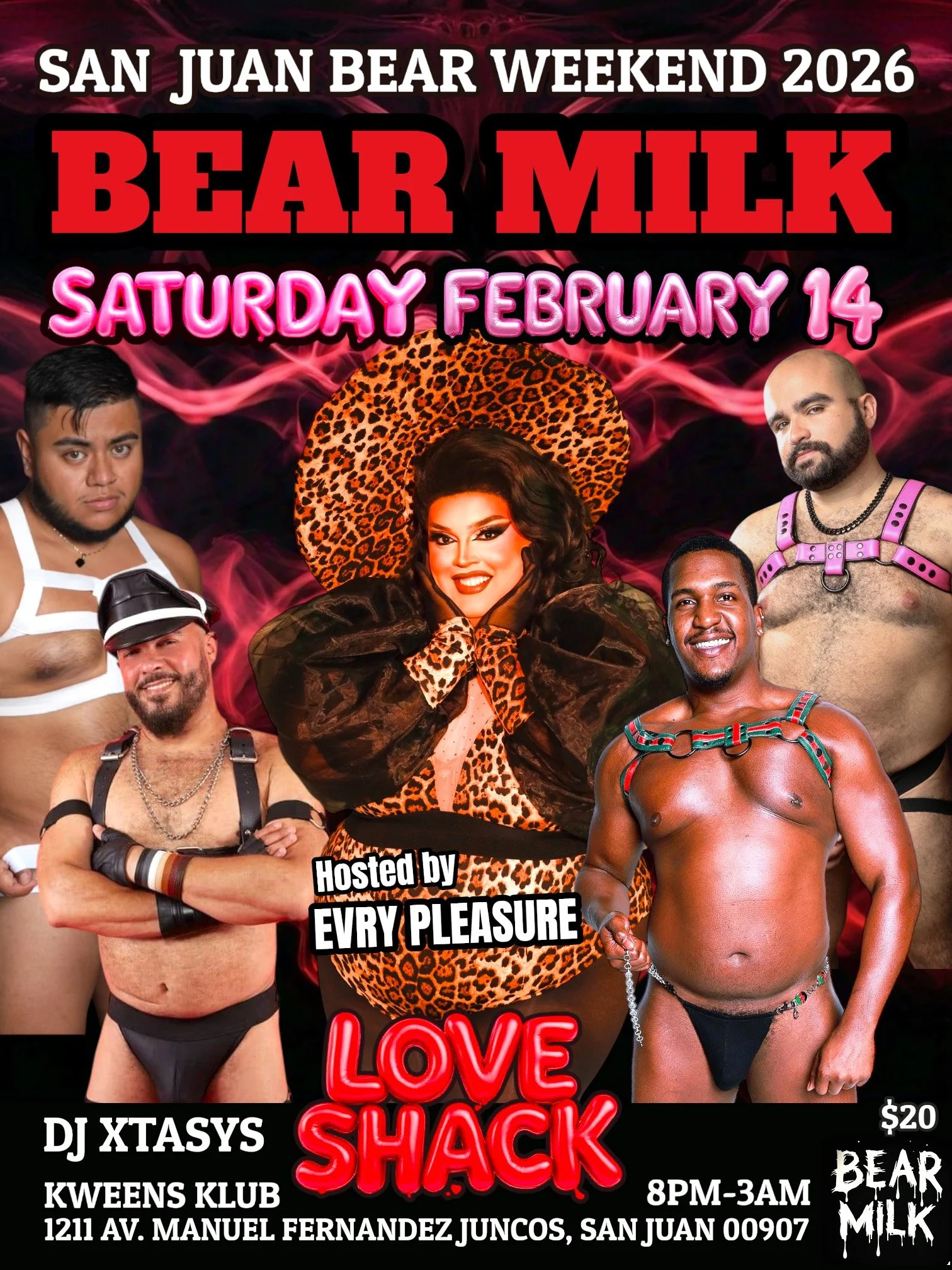 Official Saturday Night event! BEAR MILK Underwear Party “Love Shack Valentine’s Day” theme. Music by DJ Xtasys. Performances by Evry Pleasure with Bear Milk Gogo Squad. 8pm-3am at Kweens Club! Saturday February 14th